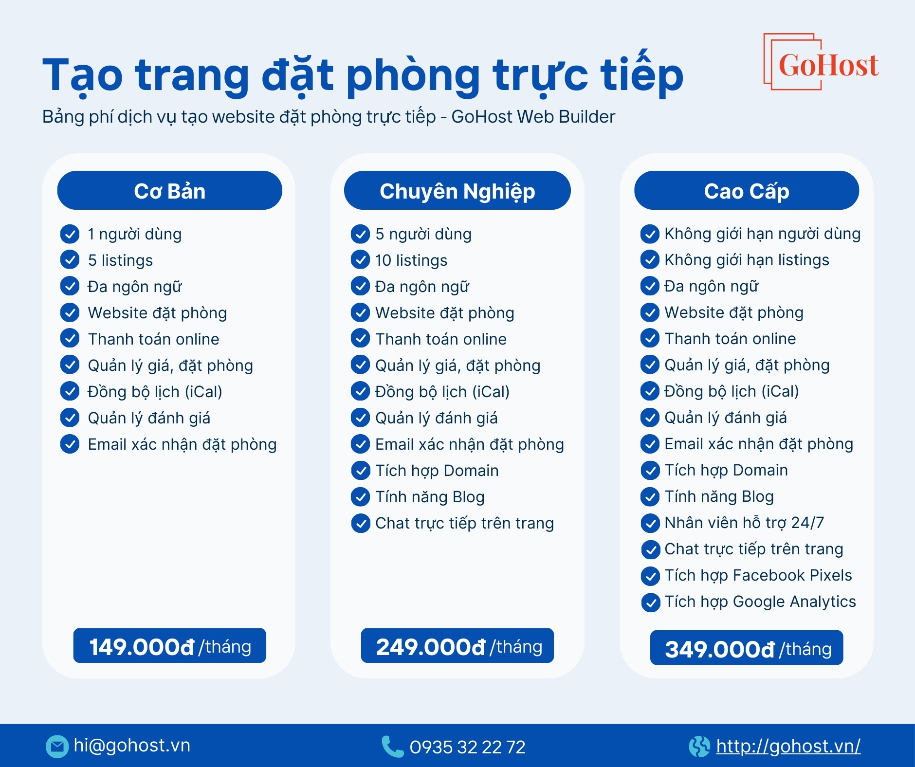 GoHost là giải pháp tạo Website đặt phòng và Quản lý mô hình kinh doanh lưu trú, giúp chủ nhà tăng doanh thu đặt phòng trực tiếp từ website mà không mất phí hoa hồng.