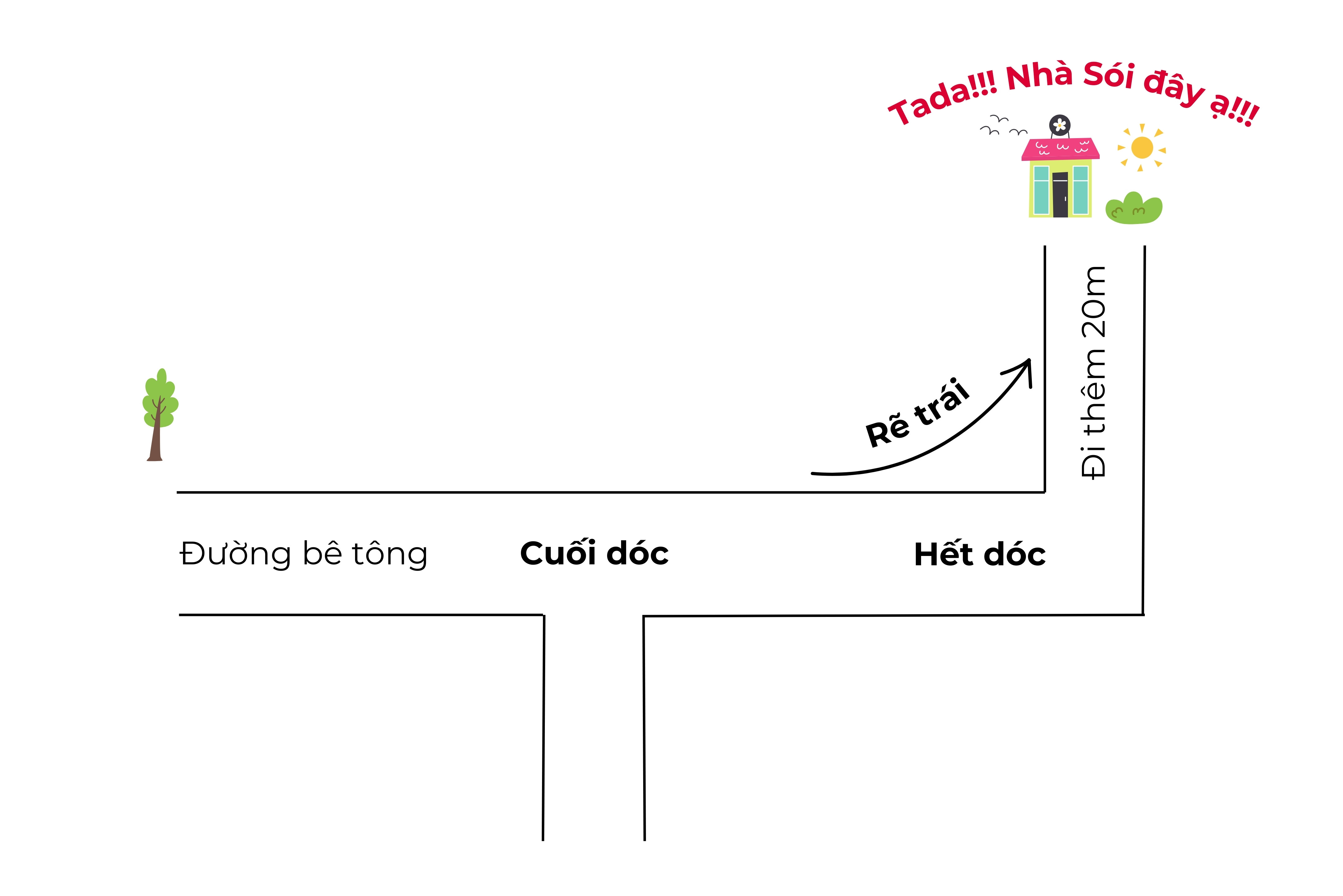 Cuối dốc có đường bê tông bên tay phải > BỎ QUA > tiếp tục xuống hết dốc và rẽ trái đi tiếp tầm 20m thấy NHÀ SÓI bên tay phải