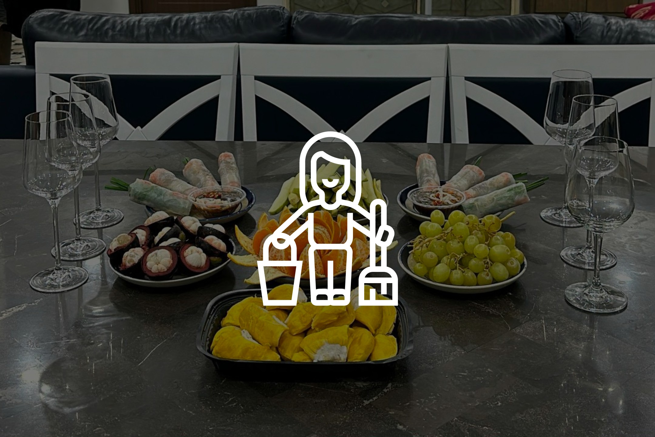 Sau tiệc KH tự vệ sinh khu vực chơi (dọn vệ sinh khu vực nướng, chén đũa vật dụng, đảm bảo vệ sinh sạch sau tiệc) > Nhà không phụ thu. Phí dọn dẹp vệ sinh cho ăn uống, BBQ : 100.000/người/tiệc